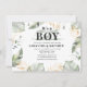Wild, calm, and elegant boys safari animal baby shower invitation featuring a giraffe, gold effect and green leaves. Perfect for boys baby shower invitations