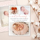 Baby Girl Birth Announcement 3 Photo Collage Cards. Elegant minimalist cute birth announcement featuring 3 of your favourite baby photos on front, with a pretty hand lettered text „introducing” in a swirly calligraphy script with swash or tails in blush pink. Add your baby's name on the front and birth stats. At the back side one vertical baby photo on white dots soft blush pink background. You can easily personalise it.