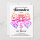 Invite guests to your event with this delightful 5th birthday party invitation, showcasing a charming bow sketch in vibrant watercolor gradient from purple to hot pink. The design features a girly bow with a colourful abstract pattern in all the colours of the rainbow, set against a crisp white background with playful orange paint splatters. The back of the card is a lively orange, adding an extra pop of colour. The text is fully customisable, allowing you to personalise it for a birthday, anniversary, or any special occasion. This invitation is also available in digital format and other colour variations. Order yours now!