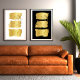 Transform your living space with this exquisite piece of artwork: an elegant, minimalist modern abstract featuring striking yellow gold brush strokes accented by delicate gold paint splatters on black background. This captivating masterpiece will effortlessly become the focal point of your living room, work area, or any corner of your home.
