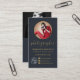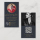 Modern gold on dusty navy blue colour photo qr code logo photographer business card. Add 2 photos, your logo, social media and qr code to show your price list, appointment, portfolio and more!. Simple with a circle photo mask and an elegant modern script brush typography,