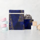 A contemporary blue and gold Christmas wrap with a shiny pattern of gold, metallic Christmas trees made of snowflakes, in a very modern, minimalist style. They're scattered over a pattern of dark blue (faux) silk. This elegant Christmas gift wrap will be sure to add a luxurious look to any gift for the holiday season.