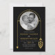 This modern wedding invitation features a captivating gold frame, that resembles a piece of delicate wire jewellery, with a photo of the couple positioned against a dark background. The frame is embellished with a leaf detail on one side and an arrow on the other, adding an elegant touch to the design. To complete the look, the backside of the invitation includes a unique pattern of the couple's names in gold on a black background, for a sophisticated and graceful finish.