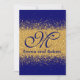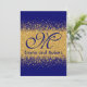 A modern wedding invitation with luxurious gold glitter confetti dissipating into a deep royal blue background. The card reverses to your text within a large blue rectangle framed in gold glitter. You can personalise with your details by clicking the customise link. This is part of a classy wedding suite which includes an envelope, a label, a menu and many more items.