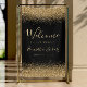The top and bottom borders of this elegant sign are decorated with gold faux glitter. Customize the text in gold colored handwriting script and serif fonts on a black background.