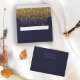 The inside of this elegant modern wedding invitation envelope features a gold faux glitter design on a dark blue background. Customise the back flap with the names of the bride and groom in gold-coloured handwriting script and return address in copperplate font on a dark blue background.