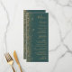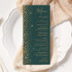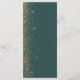 The left-hand edge of this elegant modern wedding menu features a gold faux glitter design. The customisable text combines gold-coloured handwriting, copperplate and italic fonts on a dark green background. The reverse side features a matching green and gold glitter design.