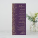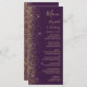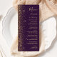 The left-hand edge of this elegant modern wedding menu features a gold faux glitter design. The customisable text combines gold-coloured handwriting, copperplate and italic fonts on a dark purple background. The reverse side features a matching purple and gold glitter design.