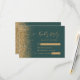 The left-hand edge of this elegant modern wedding RSVP enclosure card features a gold faux glitter border. The customisable text combines gold-coloured handwriting, copperplate and italic fonts on a dark green background. The reverse side features a matching green and gold design.