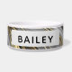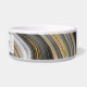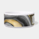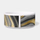 A pet bowl with an abstract design with an agate geode mineral pattern. Gold, grey, white, and black swirl together forming elegant waves of colour.