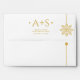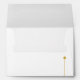 This is a graceful wedding envelope that showcases a stunning design with a gold line adorned with a flower and a dot on the right all positioned against a white backdrop. Your initials and dots are on the flap. It is part of our “Jewellery inspired gold foil wedding invitation collection” wedding suite.