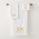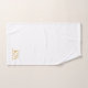 An elegant modern minimalist bathroom towel set featuring gold name and initials on white.