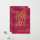 This modern no-photo holiday card features a vibrant hot pink background with the words "Peace, Love & Joy" typeset and filled with digital foil effect. No foil is used. Copyright ©2014 The Spotted Olive. All Rights Reserved.