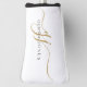An elegant modern minimalist style monogrammed golf head cover, with a sans serif name and elegant gold swash script initials on white.