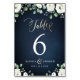 Modern faux gold table calligraphy and watercolor white floral eucalyptus greenery on dark navy blue background, elegant and stylish, great for greenery rustic wedding, botanical garden wedding, boho floral wedding in summer and winter.