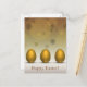 An abstract and modern Easter illustration featuring 3 golden Easter eggs on a bokeh background with abstract flowers.