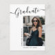 This modern elegant yet simple graduation announcement card, features modern text with elegant calligraphy script. The graduates photo highlights the front of the card while the back of the card offers personalised text spaces for information about the graduation and future journey. Black writing on white or easily customise the background to a colour of your choice. To see more items like this, visit my store here at "www.Zazzle.com/LakeViewCardCo". Thanks