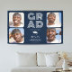 Simple GRAD photo collage graduation banner. Design features 4 square pictures of the grad, decorative lettering, a mortarboard, name, place of study and class year. The navy blue background can be changed to any colour of your choice.