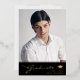 Amazing real foil graduation announcement card, featuring design elements of modern text fused with elegant calligraphy script. The graduates photo highlights the front of the card while the back of the card offers personalised text spaces for information about the graduation and future journey. Backgrounds are black with a thin gradient on the front and regal shades of grey and black on the back. To see more items like this, visit my store here at "www.Zazzle.com/LakeViewCardCo". Thanks