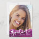 Create a stunning graduation photo announcement featuring trendy magenta and pink colours and faux pink glitter for your daughter with chic handwritten script typography for the title GRADUATE accented with a graduation cap or mortarboard in white on the front. The back side features a photo and your custom text to include details about your graduate. Makes a unique design that reflects her style and coordinates with her pictures to share with your friends and family. ASSISTANCE: For help with design modification or personalisation, colour change, resizing or transferring the design to another product, contact the designer BEFORE ORDERING via the Zazzle Chat MESSAGE tab below or email makeitaboutyoustore@gmail.com.