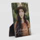 Celebrate your graduate's achievement with a custom graduation photo keepsake. The photo plaque features the graduate's vertical photo with "graduate" displayed in a trendy white script. Personalise the modern graduation photo plaque by adding the graduate's name, school, and graduation year.