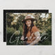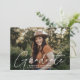 Celebrate the grad with our stylish photo graduation announcement. The graduation announcement displays the graduate's photo with "Graduate" in a white modern calligraphy script overlay. Personalize the front of the modern graduation announcement by adding the graduate's name, school name, and graduation year. The announcement reverses to feature a trendy black and white dotted geometric pattern. The design is perfect for both high school and college graduates.