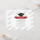 A modern graduation invitation card featuring a black graduation cap with yellow tassel, a red banner and grey and white chevron pattern. Easily customise this card by clicking the "Personlize" button above. We have matching accessories and other graduation cards available in our store.