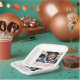 Modern graduation paper plates featuring your photo and the text "graduate" in a modern fornt with your year, school name or name below. Dark blue and orange text on white background.