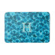 Modern graphic floral bath mat with a custom monogram in an all over pattern of dahlias - mixed media digital art in shades of blue, from pale ice blue to deep indigo