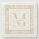 Modern and elegant blush monogram coaster with your custom initial and name within a greek key border frame surrounding in coastal mediterranean colour way.