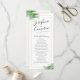 Realistic looking green palm tree leaves surround a gold-coloured geometric border on a simply modern and elegant tropical beach destination wedding program with minimalist flair.