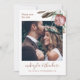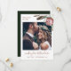 Chic boho floral wedding save the date features modern script typography and one photo with a dark green back.