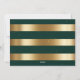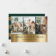 Modern custom green and gold Merry Christmas photo cards featuring green and gold stripes with gold confetti at the back and photo collage on the front. Easily personalise these photo collage Christmas cards with your images and text.