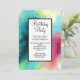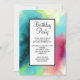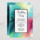 Birthday party invitation with a cool and stylish abstract design. Watercolors mix and mingle to create the illusion of a space image. Green with hints of purple, yellow and light red blend together with a smattering of white dots and stars. An elegant artistic creation.