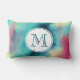 A pillow with a cool and stylish abstract design. Watercolors mix and mingle to create the illusion of a space image. Green with swirls of purple, yellow and light red blend together with a smattering of white dots and stars. An elegant artistic creation. A circle layered over top with your monogram initial inside.