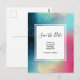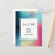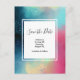 Save the date postcard with a cool and stylish abstract design. Watercolors mix and mingle to create the illusion of a space image. Green with swirls of purple, yellow and light red blend together with a smattering of white dots and stars. An elegant artistic creation.