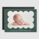 Simple and modern birth announcement magnet featuring your baby's photo nestled inside of a forest green scalloped frame. Personalise the birth announcement magnet by adding your baby's name and additional information in white lettering.