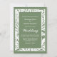 A modern green with a white botanical leaf framed wedding invitation.