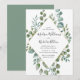 Elegant, modern wedding invitation featuring your wedding details surrounded by a faux gold foil geometric frame with watercolor leaves. The reverse side features a solid green background. Designed to coordinate with our Modern Greenery wedding collection.