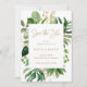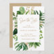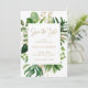 Modern botanical save the date card with your details inside of a geometric frame surrounded by watercolor painted tropical greenery and faux gold leaves. The backside is a matching gold tone. An elegant save the date card that is great for a summer wedding.