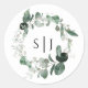 This modern greenery white monogram wedding sticker design features easy mix and match coordinating styles in black and white with delicate greenery elements adding graceful flourish around simple sophisticated typography and lovely minimal calligraphy script. The watercolor eucalyptus and other botanical leaves arch beautifully throughout, with dark emerald fading in an ombre effect to light mint green - to add just enough of a classy touch of rustic nature to a neutral contemporary backdrop. This gorgeous collection would perfectly create an air of polished elegance for your formal or casual dream wedding or other special event. As with all of our designs, if you have any questions or special requests, please reach out.