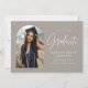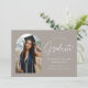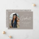 Trendy graduation announcement featuring the graduate's photo framed by a greige arch with "Graduate" in a white handwritten script. Personalise the front of the arch graduation announcement card by adding the graduate's name, graduation year, school name, and future plans. The photo graduation announcement reverses to display a grey/beige and white dotted pattern. The announcement is suitable for both high school and college graduates.