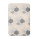 Pretty modern bath mat design features grey and white flowers with swirls and outlined leaves in silver grey on a pastel peachy pink background.