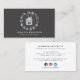 Modern trendy grey business card designed for a commercial or residential services for cleaning, housekeeper, maid service, or janitorial supplies. Design featuring of grey house icon and cleaning equipment icons around it. Customise the front with two lines of custom text on a black background, and add your full contact details to the back and social media details. Trendy chic modern design.