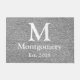 Modern grey herringbone doormat with white monogram letter, family name, and established date.