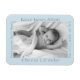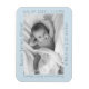 Modern and sweet baby announcement is perfect for black and white photos especially and features a baby blue background with grey font. Each of the four sides is customisable to contain a different detail about baby.