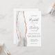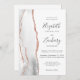 The left-hand edge of this elegant modern wedding invitation features a grey and white watercolor agate border trimmed with faux rose gold glitter. The customisable text combines handwriting, copperplate and italic fonts in charcoal grey on a white background. The reverse side provides space for wedding details on a solid white background, along with a QR code guests can scan to visit your website and RSVP, which saves the cost of printing and mailing separate RSVP cards.