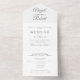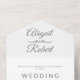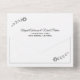 Modern grey typography and small flowers on white background all in one wedding invitation. It displays your names in a cursive script elegant style typography and two small grey flowers with leaves on both sides of the ampersand on white. The RSVP can be detached.