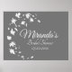 Pretty and modern bridal shower design features a spray of white flowers and white customisable text on medium grey background