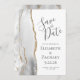 The left-hand edge of this elegant modern wedding save the date card features a grey and white watercolor agate border trimmed with faux gold glitter. The customisable text combines charcoal grey handwriting, copperplate and italic fonts on a white background. A coordinating agate design appears on the reverse.